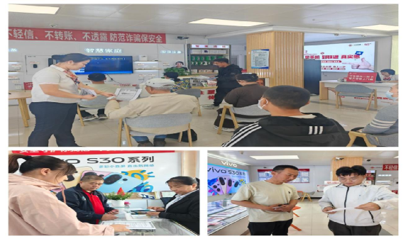 各通信企业积极响应,在营业厅网络电视上循环播放网络安全、电信防诈以及相关科普内容;工作人员向办理业务的群众发放宣传单,结合电信网络诈骗典型案例,讲解识别技巧与防范方法,提醒群众保护个人信息,谨防诈骗陷阱。